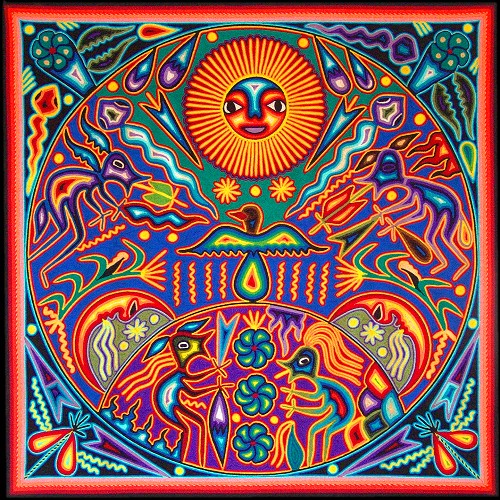 Peyote is a cactus which contains mescaline, one of the classic psychedelic chemicals. Native North Americans have been using peyote for religious purposes for around 5,000 years. It is native to southwestern Texas and Mexico. Peyote art, art that is influenced by the visions from the peyote experience, is abundant in the Huichol culture of western central Mexico. The rituals involving peyote feature singing, weeping and making contact with ‘ancestor spirits’. Here are some examples of peyote-influenced art from the Huichol culture: