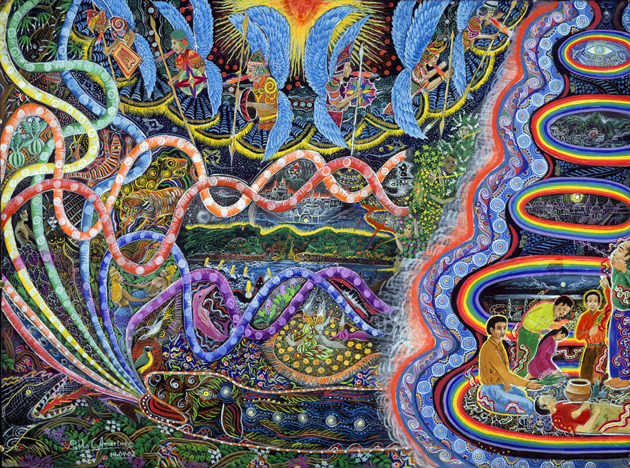 And of course, there are clear examples of art that is heavily influenced by psychedelic experiences, which once again points to the creative power of psychedelic drugs. The artwork of the Peruvian shaman Pablo Amaringo is an excellent example of this. Many people have confirmed his ability to capture some essential features of the ayahuasca experience – in his paintings, you will notice cosmic snakes, double helixes, strange worlds, palaces, goddesses, helper beings, fantastic neon colours, and the energy and light of a living jungle. For more on how ayahuasca influenced Amaringo’s work, it is worth reading The Ayahuasca Visions of Pablo Amaringo.